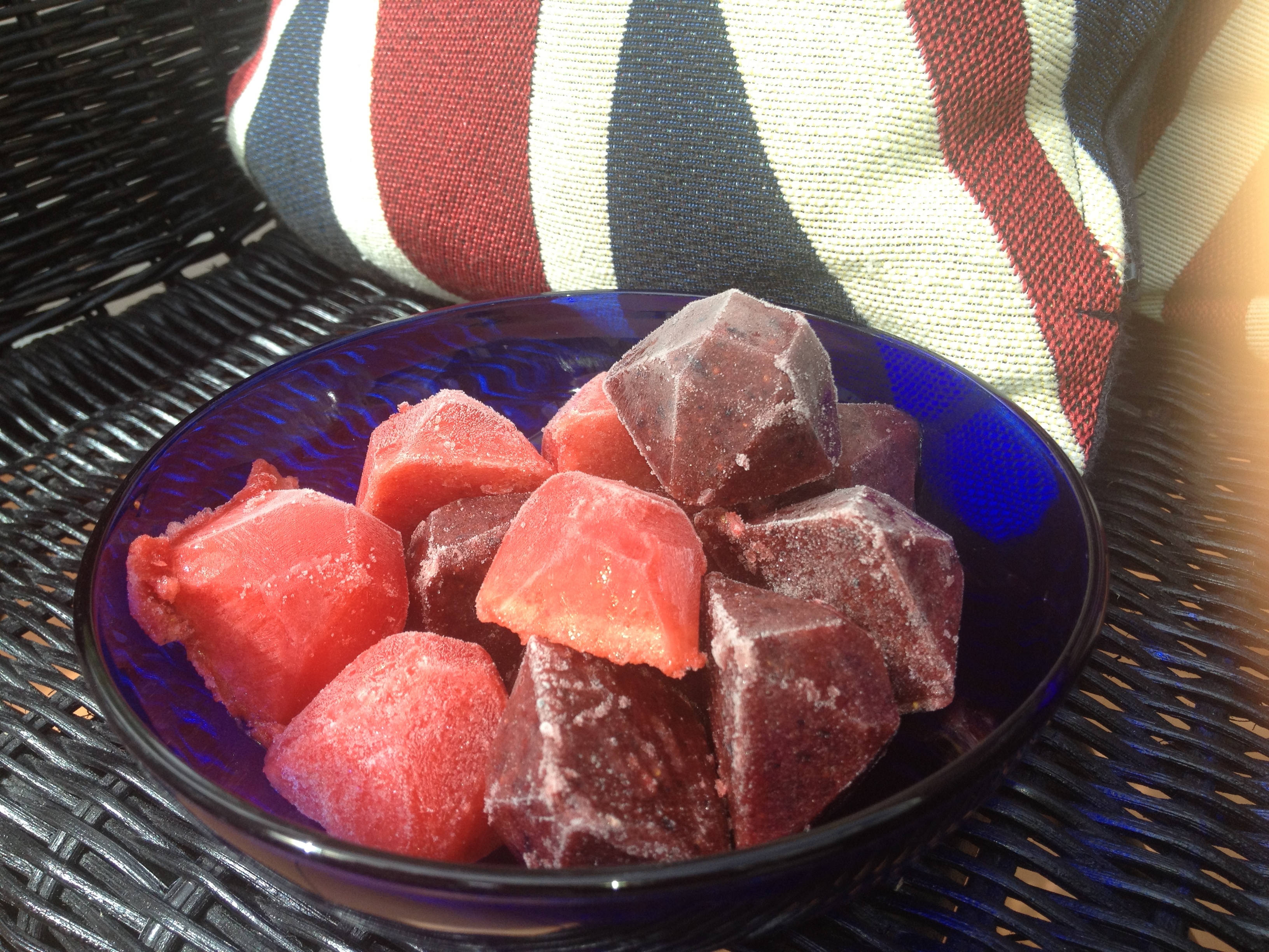 Put all ingredients in a blender and blend really well into fruit smoothie adding a little water to make sure it’s the consistency of a liquid as oppsed to fruit pulp, then pop into ice cube trays or iceblock moulds to freeze.