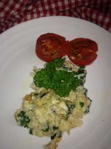 All you need to do is scramble your eggs, add whichever herbs you have growing fresh in your garden just as the eggs are about one minute off being cooked, in quantities that suit your taste – if you hate parsley leave it out and add something else.