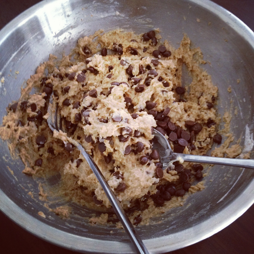 Mix as you would with a normal cookie recipe. Cream the butter and sugar, add the egg, mix and then add dry ingredients and then the chocolate drops.