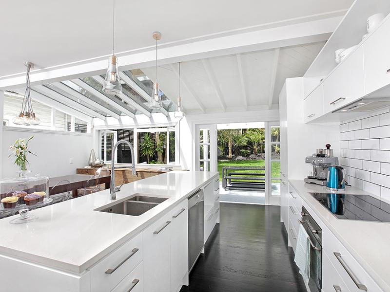 The new kitchen, wall removed to make it open plan, 3 meter long Island with stone bench and bench seating for six